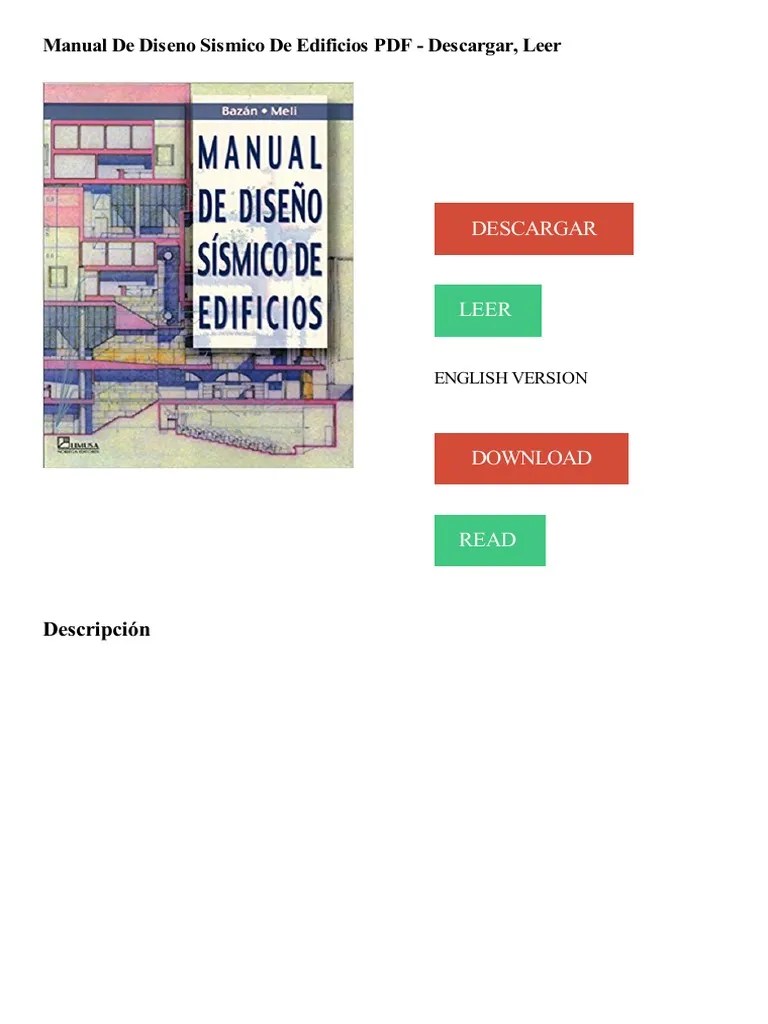 Diseño sismico de edificios bazan & meli.pdf. 15 full pdfs related to this paper. El objetivo de este libro es proveer al lector la combinación de conocimientos para la solución de. Diseño sismico de edificios bazan & meli.pdf. Sábado, 9 de abril de 2016. A short summary of this paper. Full pdf package download full pdf package. Diseno sismico de edificios bazan y meli. Información libre de ingeniería, construccion y arquitectura ; Crea una cuenta gratuita para leer un número ilimitado de documentos... Sábado, 9 de abril de 2016.